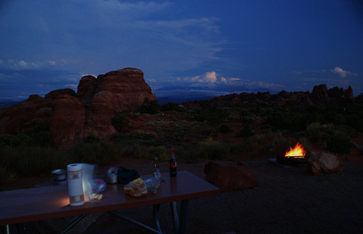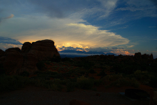 Wieder auf dem Campground angekommen, genoss ich am Abend im Osten das Wolkenspiel in den La Sal Mountains. Man könnte meinen, die Sonne stünde hinter den Bergen und ginge dort unter.