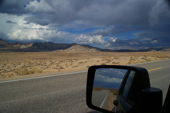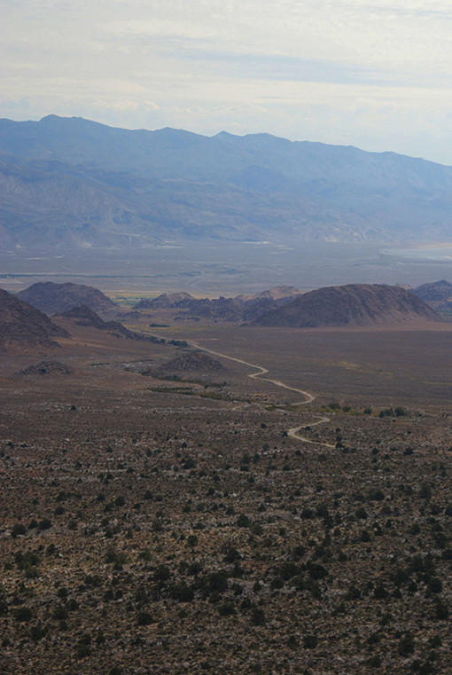 Blick man nach Osten, sieht man den halbvertrockneten Salzsee Owens Lake. Da hinter beginnt das Death Valley. Genau der Weg lag an diesem Tag noch vor mir.