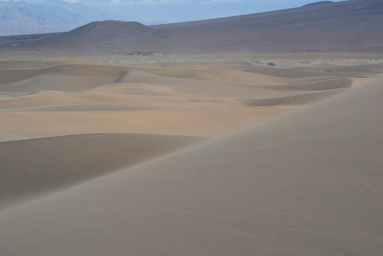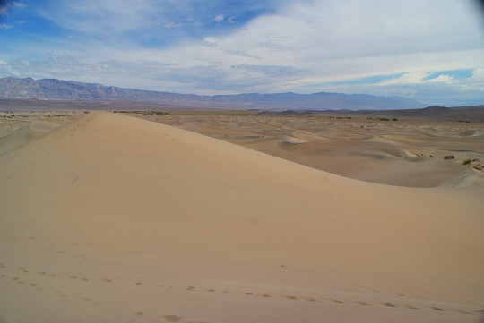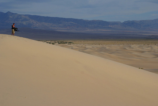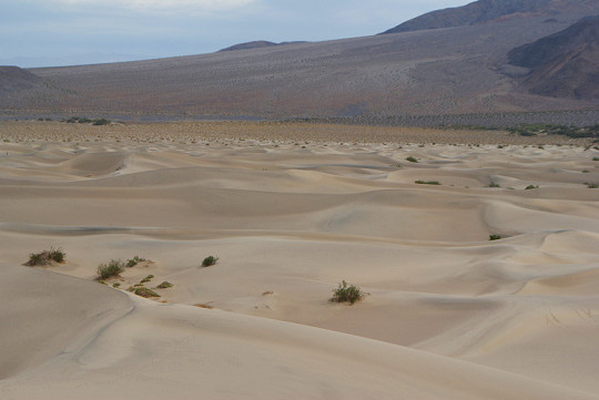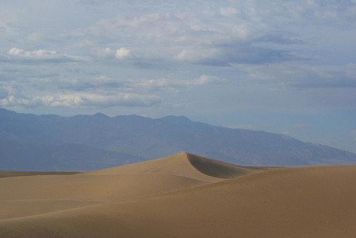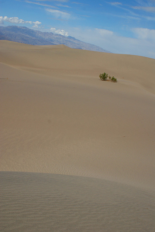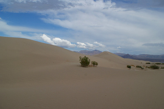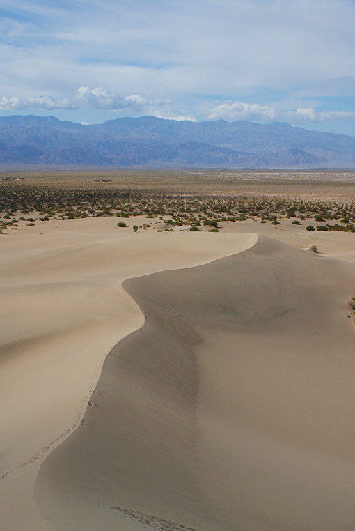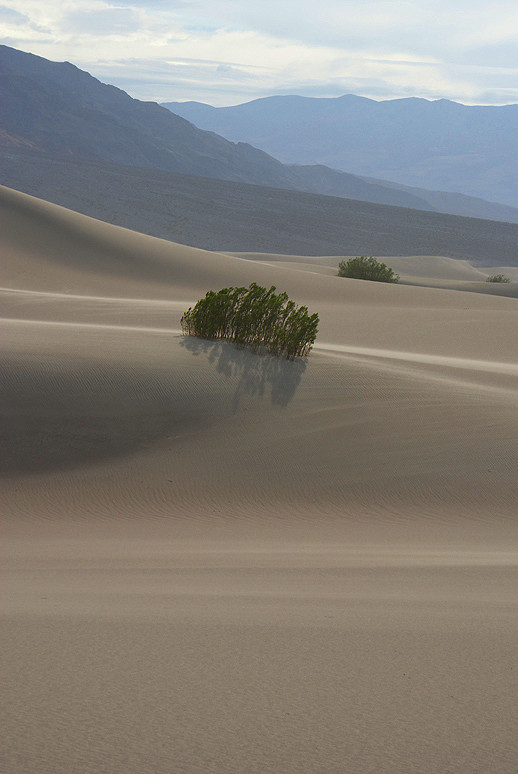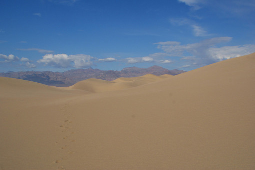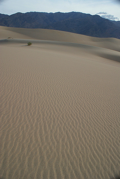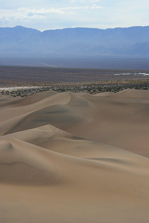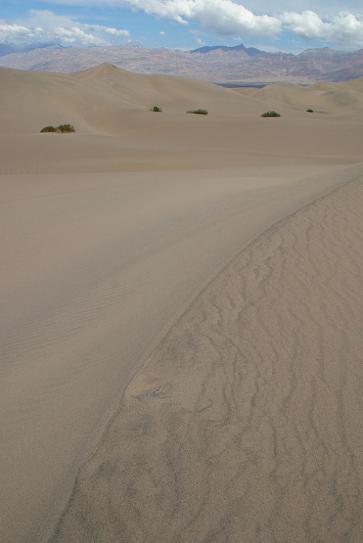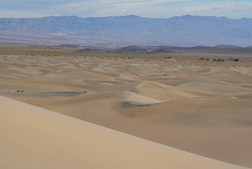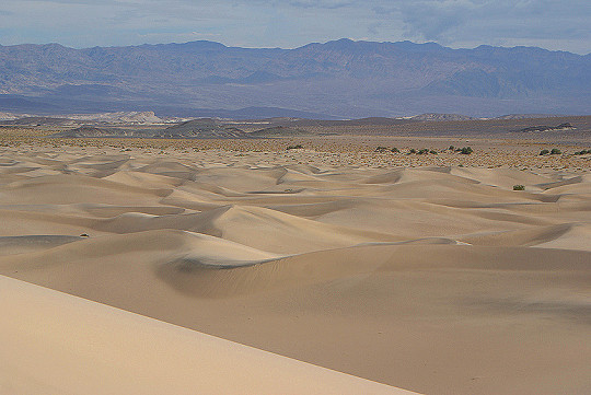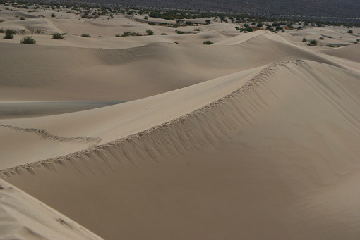 Im nördlichen Teil des Death Valley befinden sich die Mesquite Flats Sand Dunes. Es sind riesige Sanddünen aus feinem Quarzsand, die sich knapp vom ansonsten flachen Talboden abheben. Sie erstrecken sich auf einer Fläche von insgesamt rund 36 Quadratkilometern. Hier erfüllen sich optisch die Klischeevorstellungen, die man mit einer Wüstenregion verbindet. Sie liegen etwas nördlich des Highway 190 östlich von Stovepipe Wells Village. Wenn man das Death Valley durchquert kommt man zwangsläufig an ihnen vorbei. Man erkennt sie schon von weitem, besser gesagt die größte der Dünen. Die Star Dune liegt zentral in dem Sandfeld an der Stelle, wo der Wind den Sand ständig auftürmt. Dadurch ist ihre Position und Form relativ konstant. An ihrer höchsten Stelle ragt sie rund 35 Meter empor. Etwa 3 Kilometer Luftlinie ist sie vom Highway 190 entfernt. Diese Düne sollte mein nächstes Ziel sein.