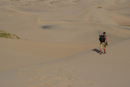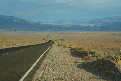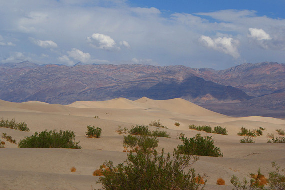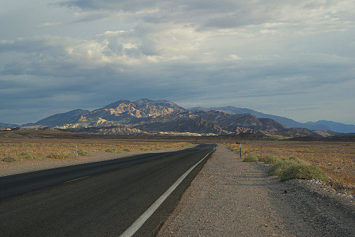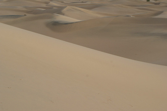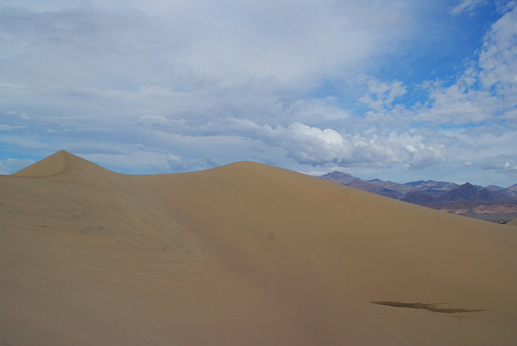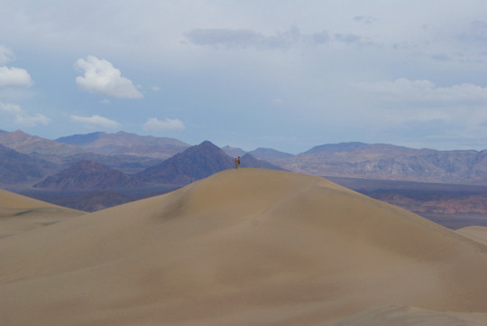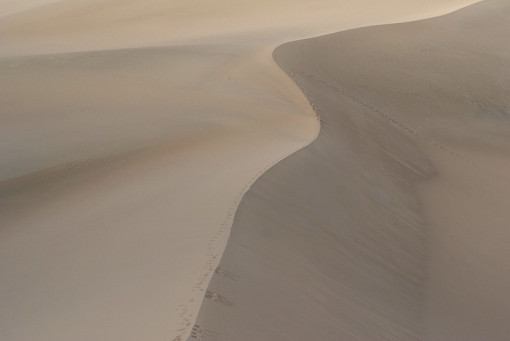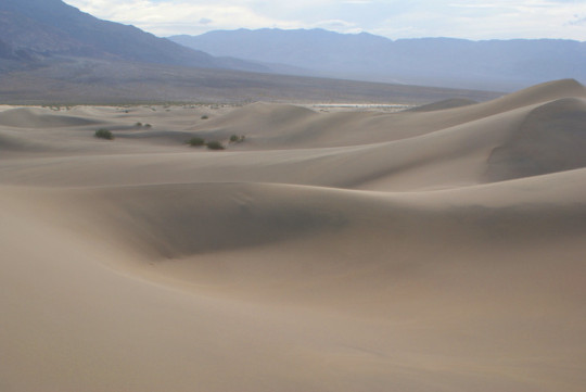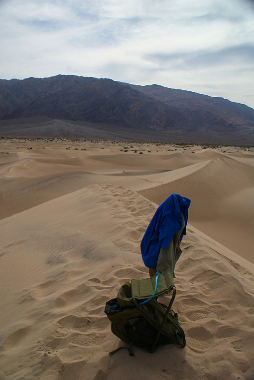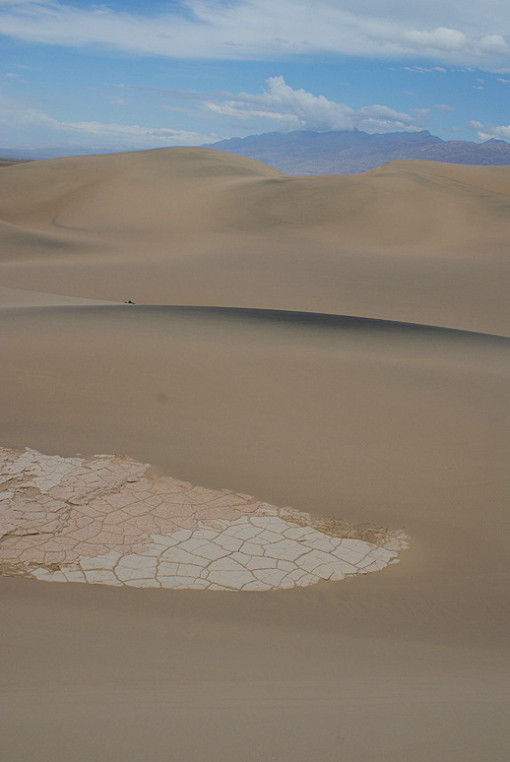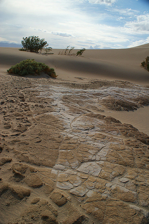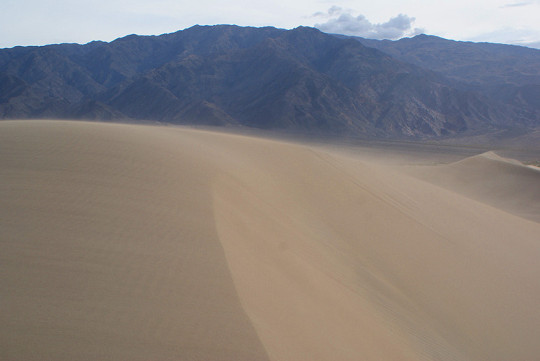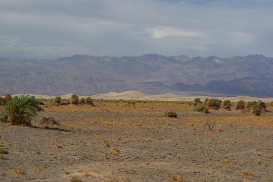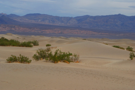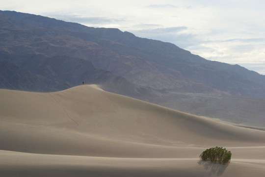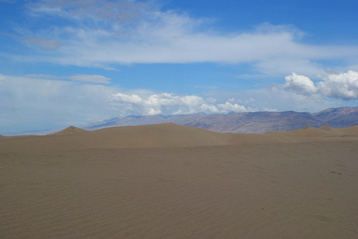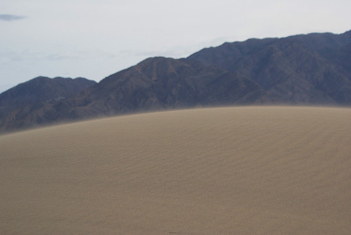 Im nördlichen Teil des Death Valley befinden sich die Mesquite Flats Sand Dunes. Es sind riesige Sanddünen aus feinem Quarzsand, die sich knapp vom ansonsten flachen Talboden abheben. Sie erstrecken sich auf einer Fläche von insgesamt rund 36 Quadratkilometern. Hier erfüllen sich optisch die Klischeevorstellungen, die man mit einer Wüstenregion verbindet. Sie liegen etwas nördlich des Highway 190 östlich von Stovepipe Wells Village. Wenn man das Death Valley durchquert kommt man zwangsläufig an ihnen vorbei. Man erkennt sie schon von weitem, besser gesagt die größte der Dünen. Die Star Dune liegt zentral in dem Sandfeld an der Stelle, wo der Wind den Sand ständig auftürmt. Dadurch ist ihre Position und Form relativ konstant. An ihrer höchsten Stelle ragt sie rund 35 Meter empor. Etwa 3 Kilometer Luftlinie ist sie vom Highway 190 entfernt. Diese Düne sollte mein nächstes Ziel sein.