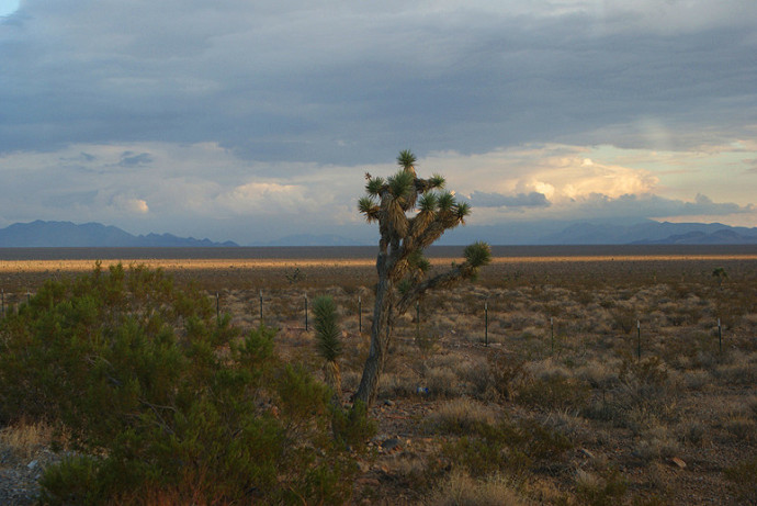 Blick nach Osten. Irgendwo da hinten liegt in ca.180 km Entfernung Las Vegas. In der Nacht zuvor habe ich das Leuchten der Stadt sehen können. Las Vegas wird heute mein Ziel sein. Ich hatte wirklich keine Lust auf Rückkehr, wollte diese Landschaft einfach nicht verlassen.