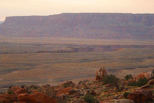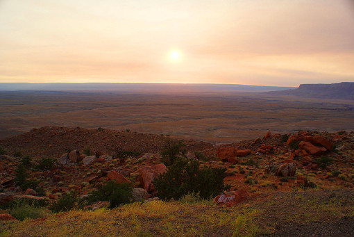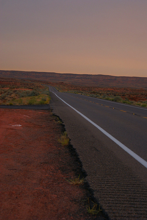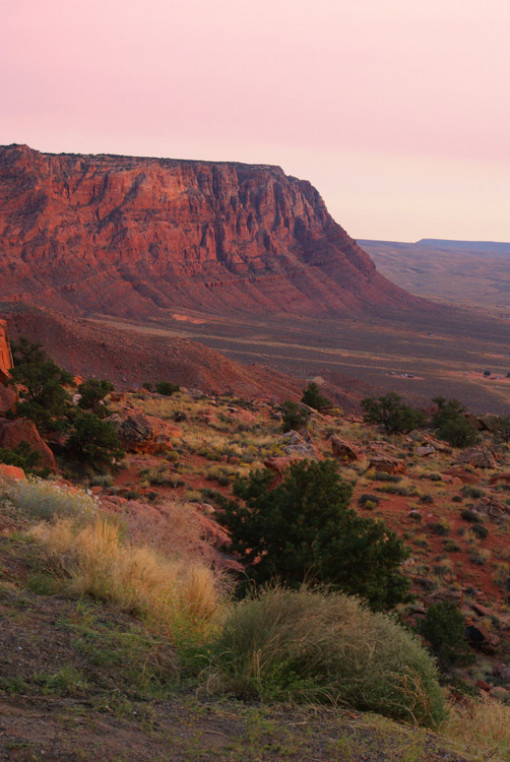 Kurz vor Page auf einer Anhöhe hat man einen grandiosen Blick über weite Flächen und zum Kaibab Plateau. Rechts beginnen die Vermillion Cliffs. Das bezaubernde an diesem Sonnenuntergang war, dass die staubige Luft das Sonnenlicht streute und die Landschaft in ein zartes Orange-Rosa tauchte.
